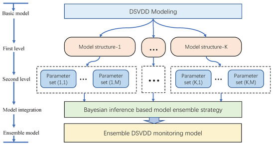 In the Figure 3, there are a series of DeSVDD models available. If the first level designs K groups of the model structures and the second level provides M groups of the initial parameter sets for each structure, the total number of DeSVDD models B is computed as . In order to merge all the DeSVDD models for a holistic monitoring, Bayesian inference theory is applied to design an ensemble strategy [28,29].