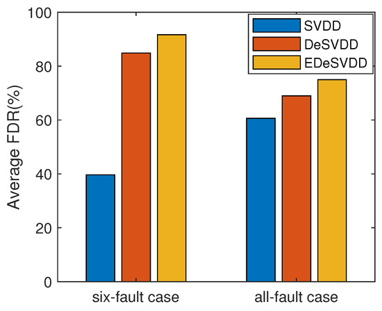 A complete FDR comparison of three methods is listed in Table 2. In this table, SVDD is the basic state-of-art model. The monitoring results of DeSVDD method are the statistical indices (i.e., mean and standard deviation) of multiple runnings. Here two model structures including 52-36-26 and 52-47-42 were considered and each model was run 10 times. The average FDR was given with the corresponding standard variation in the Table 2. EDeSVDD was the ensemble model of two model structures with the respective 10 training cycles. To evaluate the stability of results, the EDeSVDD model was also run 10 times. By this table, it is seen that the faults F1, F2, F6, F8, F12, F13, F14, and F18 had similar high FDR values, while the faults F3, F9 and F15 had similar low FDR values for all these methods. These three faults only involved the weak process changes and were difficult to detect in many algorithms. Some specific methods have been studied to deal with these three faults [37] and this paper does focus on them. In regard to the faults F5, F10, F16, F17, F19, and F20, the DeSVDD method was superior to the basic SVDD model, while the EDeSVDD further outperformed the DeSVDD model clearly. There was a special phenomenon for the faults F4, F7, F11 and F21. For these four faults, DeSVDD did worse than the SVDD model. These results demonstrate that the deep model is not almighty. As the deep learning theory is still in research, we have no conclusion about how to select an optimal deep model for the given data learning task. It is also seen that when the ensemble learning strategy is applied, the EDeSVDD model can achieve very clear improvements and may further outperform the basic SVDD model. For example, in the case of fault F21, the SVDD FDR was 37.38%, while the average FDR of DeSVDD was 36.70%. By applying the ensemble model, EDeSVDD enhanced the FDR to 45.08%. On the whole, the mean FDRs of these three methods were 60.65%, 68.99%, and 74.97%, respectively. Compared to the SVDD model, the DeSVDD model prompted the FDR with about 8%. Furthermore, EDeSVDD model had a 8.38% higher FDR than DeSVDD. Along with the improvement of the mean FDR, the standard deviation of EDeSVDD FDR decreased to 1.08% compared to the 3.99% of DeSVDD. That shows EDeSVDD has a higher detection rate with lower performance fluctuations. A comparison of average FDR is shown in Figure 11. For the six fault cases, that means the faults F5, F10, F16, F17, F19, and F20, the DeSVDD and EDeSVDD methods outperformed the SVDD significantly. Even considering all these faults, the proposed methods still had apparent advantages in terms of the fault detection performance.