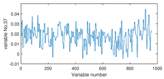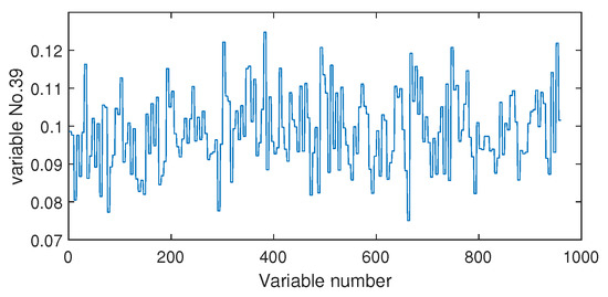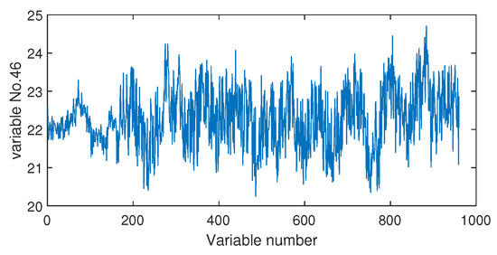 The fault isolation results of fault F19 are shown in Figure 16 and Figure 17. By Figure 16 obtained by the Pearson correlation analysis, the No. 39 variable was located as the fault cause variable, which had the largest fault association degree. This variable was the component F percentage in the product flow. As one quality variable, it may have been the fault result but could not be the fault source. Its trend is plotted in Figure 18, which shows no significant change occurred. When the distance correlation analysis was applied, the fault isolation map, given in Figure 17, brought a very clear scene, which obviously indicated the No. 46 variable as the fault cause. We plotted the variable trend in Figure 19 and observed that this variable had the larger fluctuations after the 160-th sample. As the fault F19 was an unknown fault, it was impossible to verify our analysis by process mechanism. However, the variable changing trend plots demonstrated that the distance correlation analysis could provide more effective fault isolation compared with the Pearson correlation analysis.