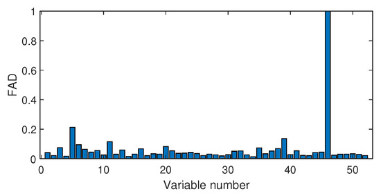 Next, we discuss the results of fault isolation. Fault F10 is taken as one example. When this fault occurred, we collected the corresponding fault data and computed the fault association degree with the monitoring index by the Pearson correlation and the distance correlation , respectively. The fault isolation map using the Pearson correlation is given in Figure 12. By this figure, many variables such as variable Nos. 22, 37, 46, and 50 were all with high FAD values. In fact, a total of 14 variables had a fault association degree larger than 0.6. It was difficult for engineers to locate the real cause variables. By contrast, the distance correlation gave a better result in Figure 13. Only six variables had the large values beyond 0.6. Among these six variables, the 18th variable, that corresponded to the stripper temperature, was the most significant fault cause variable. By mechanical analysis, fault F10 was triggered by the change of the stripper feed temperature, which had the consequent influence on the stripper temperature. This can be verified by the variable trend plotted in Figure 14. Therefore, once the stripper temperature was located, the real fault cause could be easily found. The fault isolation map in Figure 12 indicates the 37th variable as the most possible cause, which corresponded to the component D percentage in the product flow. In fact, this variable was not influenced seriously by Figure 15. So, the mechanical analysis of this fault demonstrated that the fault isolation map based on the distance correlation did better.