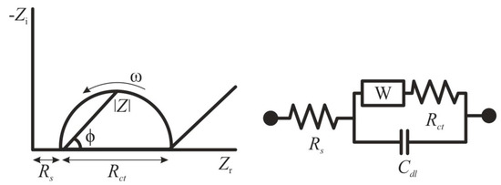 In recent years, many researchers have applied EIS for the determination of specific pathogenic flaviviruses [55,56,57]. This method stands out among other electrochemical methods, since the analysis proceeds without irreversible changes in the electrode material, and does not require a high consumption of chemical reagents [58]. EIS is based on the detection of changes in resistance on electrode before and after modification by a biological material [48]. The impedance Z of a system is generally measured by applying a voltage perturbation with a small amplitude and detecting the current response. The impedance is a complex value, since the current can differ not only in terms of the amplitude, but it can also show a phase shift ϕ compared to the voltage–time function. Thus, the value can be described either by the modulus |Z| and the phase shift φ or alternatively by the real part Zr and the imaginary part Zi of the impedance (Figure 1) [58]. The registration of the EIS spectra is carried out in the presence of a redox probe—a substance capable of rapid reversible single-electron redox transformation [59]. Ferri/ferrocyanide systems or ruthenium complexes are usually used as such redox markers [60,61]. Typically, the obtained impedance spectra are fitted to an equivalent circuit using a Nyquist plot for illustration, and the change in charge transfer resistance is correlated to the target biological material concentration [62]. For the situation of an electrode in contact with an electrolyte, the so-called Randles circuit is used (Figure 1), comprising the double-layer capacitance Cdl, the solution resistance Rs, the charge transfer resistance Rct, and the Warburg impedance W.