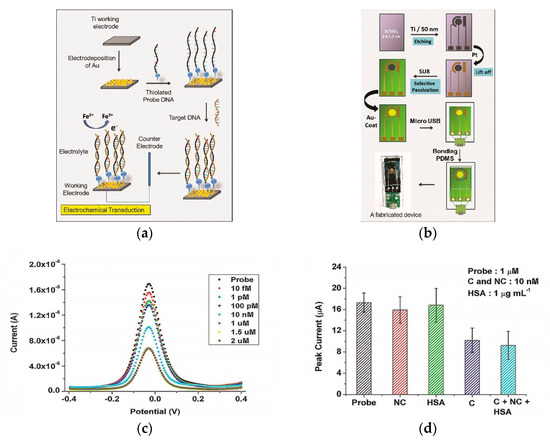 (a) Schematic representation of the gold nanostructure-based working electrode fabrication and the subsequent DNA immobilization protocol; (b) schematic representation of the process flow for the miniaturized electrochemical biosensor platform fabrication. SU8—Epoxy-based negative photoresist, PDMS—poly(dimethylsiloxane); (c) differential pulse voltammetry (DPV) recordings for Ti/Au/probe electrodes at different target DNA concentrations; (d) influence of interferents (NC—non-complementary DNA, C—complementary DNA, HSA—human serum albumin) as non-complementary targets at probe concentration 1 µM. Adapted with permission from [50].