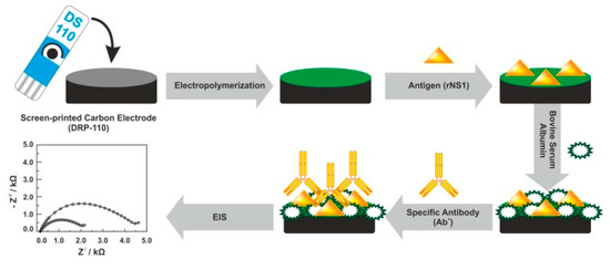 Fabrication protocol of the impedimetric immunosensor. DRP-110—carbon model of screen-printed electrodes, rNS1—non-structural recombinant protein 1, EIS—electrochemical impedance spectroscopy. Adapted with permission from [93].