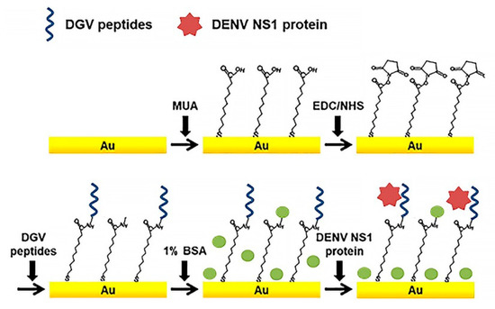 Schematic illustration of the peptide-decorated electrochemical sensor for the detection of dengue fever biomarker, NS1. DGV peptides—synthetic phage-displayed peptides, specific for NS1, MUA—11-mercaptoundecanoic acid, EDC—1-ethyl-3-(3-dimethylaminopropyl)carbodiimide, NHS—N-hydroxysuccinimide, BSA—bovine serum albumin. Adapted with permission from [44].