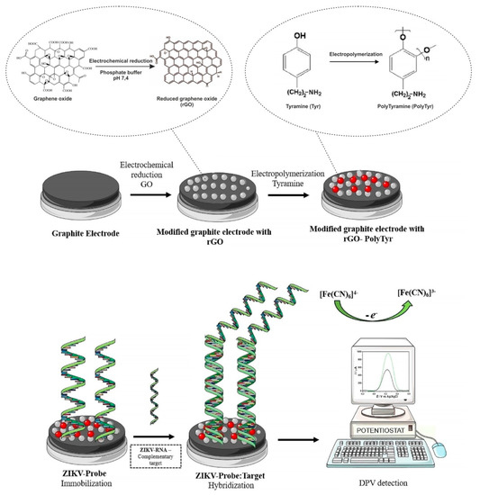 Schematic illustration of the electrochemical biosensor construction and Zika virus (ZIKV) detection. rGO—reduced graphene oxide, PTyr—polytyramine, ZIKV-Probe—ZIKV DNA probe, gRNA—genomic RNA, DPV—differential pulse voltammetry. Adapted with permission from [26].