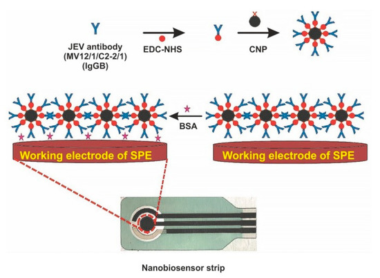 The immobilization of biomolecules plays an important role in the development of sensitive biosensors. Several studies paid attention to the application of nanomaterials for conjugation with a bio-recognition element. For example, Zhang et al. immobilized AuNPs and [Co(bpy)3]3+ in differently charged states on the AuE modified by l-cysteine and, afterwards, they immersed thus modified electrode into solution with the bio-recognition element (antiserum of JEV) [42]. The detection principle of JEV is based on the variation of potentiometric response before and after immunoreaction, with LOD of 3.5 × 10−8 pfu/mL. Another interesting approach is based on the deposition of polyaniline (PANI) nanowires at the PtE surface for immobilization of anti-JEV IgG [38]. The developed PANI nanowires electrochemical biosensor detects JEV by EIS, with LOD below 10 ng/mL. Carbon nanoparticles (CNPs) are also frequently exploited in JEV electrochemical biosensors. They are characterized by excellent electrochemical properties, low cost, and good deformational stability [120]. Chin and co-workers successfully applied CNPs for conjugation with JEV antibody and detection of JEV in human serum samples on a SPCE, with LOD of 2 ng/mL [121]. Another research group also modified a SPCE by CNPs for rapid and sensitive detection of JEV in human serum, with an LOD of 0.36 ng/mL [70]. Figure 6 depicts the preparation of the electrochemical biosensor for the detection of JEV with using CNPs as an immobilization platform for the JEV antibody [70].
