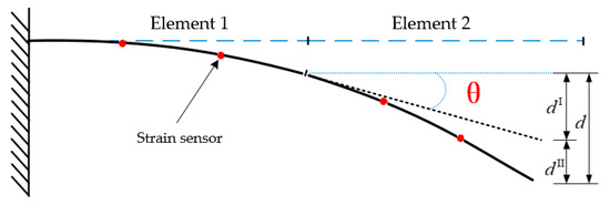 Strain sensors are placed on the surface of a multi-element frame to measure its surface strain, as shown in Figure 1. Then, inverse FEM can be used to reconstruct the structural deformation displacement of the multi-element frame, using the collected strain. The displacements are composed of two parts: one is elastic displacement, and the other is the projection displacement, which is caused by rotation of the first element.