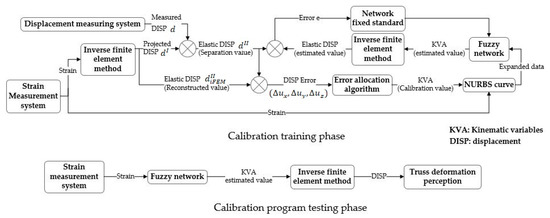 After expanding the strain and error distribution results, the extended samples are used to train the SSFN. The measured strain is input into the SSFN, and the error distribution results are obtained. Then, the elastic displacement after calibration can be obtained. The error can be calculated by the calibration displacement and the separated elastic displacement . When reaches a set standard, the existing SSFN is saved, completing the establishment of the fuzzy calibration network. The calibration algorithm block diagram is shown in Figure 4.