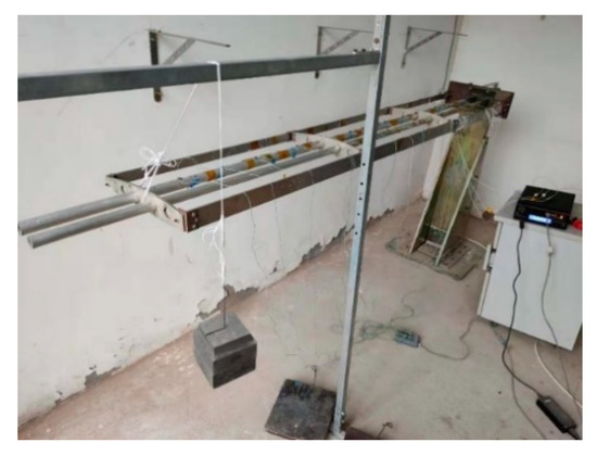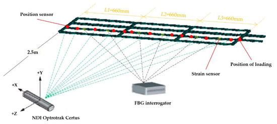 Displacement measurements were performed at different locations along the beam with position sensors (see Figure 5b). The infrared light captured by the position sensor was detected by a three-dimensional dynamic displacement measurement instrument (NDI Optrotrak Certus, NDI, Canada; shown in Figure 5c), and the deformation of the frame was measured by the position sensor. The accuracy of NDI was 0.1 mm within its measurement range. The positions of the position sensors are shown in Table 2. The sensors numbered 5, 11, and 16 were used to measure the displacement of the end of each element, and the sensors numbered 3, 8, and 14 corresponded to the internal node positions of the three elements, respectively. When the strain measurement system collected strain data, the NDI collected displacement information at the same time. The entire experimental system is shown in Figure 6.