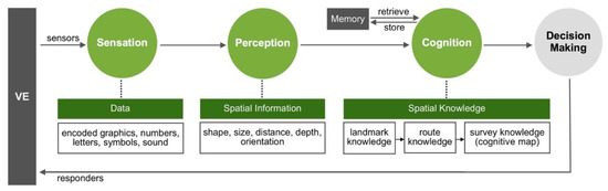 Spatial cognition emerges from the interaction between an organism and environmental characteristics [16]. Figure 1 shows human information-processing stages regarding navigation in VEs. Firstly, users pay attention to virtual stimulus such as graphics and text on navigation aids and collected encoded sensory data in several sensory organs. Then spatial information from the various senses and from memory are manipulated or reorganized by cognitive systems [17]. Humans understand the meanings of pivotal landmarks and acquire route knowledge which is integrated by survey knowledge [18,19]. Thus, visual information significantly contributes to forming a cognitive map [20], which represents the spatial environment in the brain [21]. Prior experimental studies have demonstrated significant influence of different visual designs of a navigation aid on user performance and subjective evaluations in VEs. For example, positive landmarks in a VE are more accurate in locating the landmarks and drawing the route as compared to negative and neutral landmarks [16]. The 3D arrows outperform the two-dimensional (2D) arrows in terms of navigation performance and user preference in an abstract desktop VE that did not resemble any unfamiliar environment [12]. The 2D wedge outperform the 3D wedge with respect to navigation performance and interface usability in a VE [22]. Nevertheless, there are currently no specific design guidelines pertinent to overview maps for VE interfaces.
