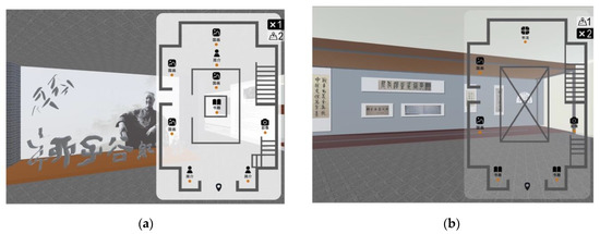 The prototype of VE is created with the 3DS Max software and the Unity 3D game engine. A two-story museum unfamiliar to the participants has been simulated. It consists of nine exhibition areas placed on the ground floor, including four Chinese painting exhibition areas, three introduction exhibition areas, a book exhibition area and a photographic exhibition area. Six exhibition areas are placed around the second floor, which is smaller than the ground floor. There are two Chinese painting exhibition areas, two book exhibition areas, a photographic exhibition area and a Chinese calligraphy exhibition area on the second floor. The overview map interfaces are created with the Photoshop software (see Figure 2). Landmarks with images and text are used to distinguish different exhibition areas. For the experiment, six different overview maps are constructed (see Figure 3).