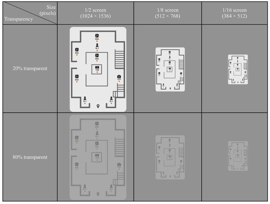 The above-mentioned studies have shown that the visual variables of size and transparency may play crucial roles in dealing with visibility issue, which is the most prevalent perception issue that can limit users’ experience of a VE interface [8]. The studies on the size or transparency of overview maps in VEs are summarized in Table 1. Altering the size or transparency of an overview map changes the perceptual cues in users’ visual fields. However, studies pertaining to detailed design guidelines on the overview maps in VEs are still insufficient. Thus, the effects of the size and transparency of overview maps on users’ spatial perception and their subjective evaluations of VE interfaces are expected to be assessed in this study.