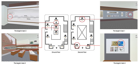 By the method of randomized block design, the participants were randomly assigned to six groups to test one of the six VE user interfaces. The participants were informed that they should perform four spatial perception tasks in sequence as quickly and accurately as possible (see Figure 4). The first task related to shape perception was to find a fan-shaped work in the Chinese calligraphy exhibition area. To complete the task, participants needed to click the floor icons to find the specific exhibition area on the second floor and then change visual angles to perceive the shapes of the virtual objects in the area. The second task concerning size perception was to search for the longest Chinese painting. Participants not only needed to get to six Chinese painting exhibition areas on two floors by clicking the landmark icons, but they also needed to perceive, memorize and compare the sizes of the virtual objects in the areas. The third task related to distance perception was to get the description of artist’s birthday in the farthest introduction exhibition area. Participants needed to compare the distances of three introduction exhibition areas on the ground floor using the overview map and then change positions to look over the details in the specific place. The fourth task about orientation perception was to find out a blue book in the book exhibition area on the west side of the entrance. Participants needed to click the floor icons to find the book exhibition area that met the requirement, and then they found the specific object in it. The participants were asked to explore the environment until they accurately found specific objects in each task. Performance with each overview map was measured in terms of the total time to accomplish four tasks and the total number of errors occurred during this process. An error was scored when the participant found the wrong object. Each error added one point to the participant’s score; otherwise the error count was zero.