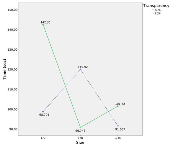 A 2 x 3 analysis of variance (ANOVA) was performed to analyze the collected data. The results generated from the descriptive statistics and two-way ANOVA of total task completion time are shown in Table 3. It revealed no significant main effect of size in terms of total task completion time (F(2,102) = 2.908, p = 0.059 > 0.05). No significant main effect of transparency (F(1,102) = 0.966, p = 0.328 > 0.05) was found. Significant interaction existed between the variables of size and transparency (F(2,102) = 6.556, p = 0.002 < 0.01).