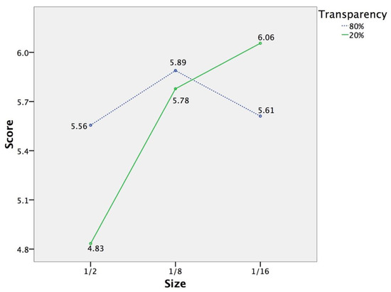 According to the interaction diagram illustrated in Figure 6, at 1/2 screen size, the preference score of the 80% transparent overview map (M = 5.56, Sd = 1.247) was significantly higher than that of the 20% transparent overview map (M = 4.83, Sd = 1.043). For the 20% transparent overview map, participants using overview maps in the condition of 1/16 screen size (M = 6.06, Sd = 0.873) and 1/8 screen size (M = 5.78, Sd = 0.647) gave significantly higher preference scores than those using the overview map in the condition of 1/2 screen size. Overall, the preference score of the 1/2 screen-size 20% transparent overview map was lower than the others. In addition, the preference score of the 1/16 screen-size 20% transparent overview map was higher than the others.