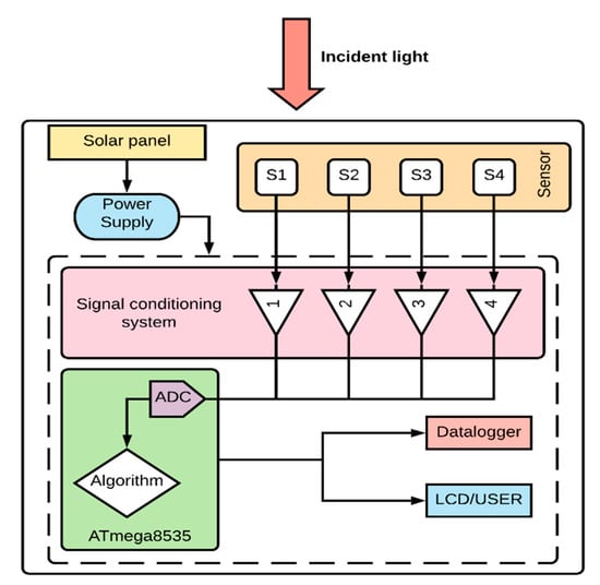 The proposed system for the measurement of SD is presented in Figure 1. The prototype is composed of four luminosity sensors using a shading pattern that is oriented to the geographic north as a method of measuring SD. The proposed SD measurement system was implemented in a low-power ATmega8535 AVR 8 MHz microcontroller with an internal 10-bit resolution analog-to-digital converter (ADC). Figure 2 shows the hardware structure of the proposed autonomous system.