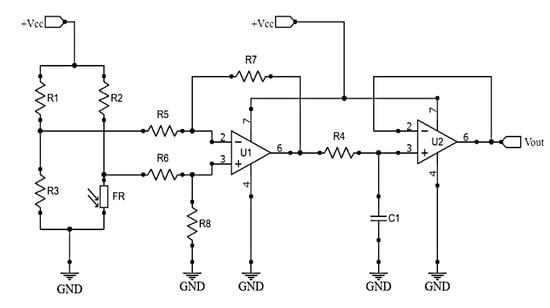 Each photoresistor element has its conditioning circuit for the output signal. The conditioning circuit is presented in Figure 3 and consists of a Wheatstone bridge, a differential amplifier (U1), and an active low-pass filter (U2). The resistors used in the Wheatstone circuit of R1, R2, and R3 were 100 Ω, 1 Ω and 100 Ω, respectively. The U1 amplified the output voltage from the Wheatstone bridge with a gain of 3.2.