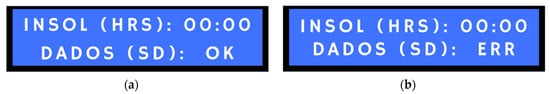 The U2 has a cut-off frequency of 700 kHz and provides an output voltage of 3865 mV ± 50 mV. The output of the signal conditioning system (Vout) is connected to the microprocessor through the analog-digital converter (ADC) with a resolution of 4.88 mV/bit. The system uses an LCD for the user interface to display data and configure parameters, as shown in Figure 4, and the LCD interface is installed in the front of the prototype. It presents the results of the total or partial period of SD. It also exhibits status messages related to success or errors in data storage. This is performed through a 16 × 2 LCD with I2C. Figure 4 illustrates two examples of data displayed.