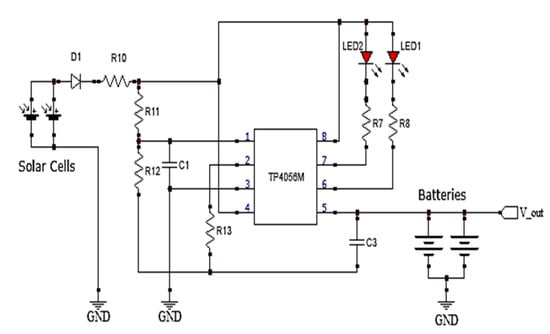 The system uses two lithium polymer (LiPo) batteries with a combined capacity of 2000 mAh, providing up to 20 h of operation. The battery bank is recharged by local irradiance using two solar panels with a power rating of 5 W. This circuit guarantees the system’s autonomy. The system integrates IC TP4056 to control the charging rate of battery banks at a constant current–voltage rate. Figure 5 presents the circuit used to manage the battery bank charging from solar panels.