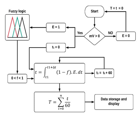 The algorithm uses a Boolean variable (E) that changes its state according to the microcontroller’s identification of four sensor voltages. The variable E assumes 1 only if the sensor voltages are positive, starting with the fuzzy logic and the timer (t1). In contrast, if the sensor voltage is negative or zero, variable E assumes zero. This procedure allows for the estimation of the SD regardless of the position of the solar disk in the sky and the moment of sunrise occurrence [,]. Figure 8 shows the structure of the implemented fuzzy logic algorithm.
