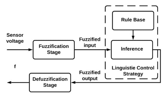 At the defuzzification stage, the linguistic rules establish a link between output f, membership functions, and its level of membership. The numerical value for f is calculated at this stage. There are several methods for this calculation in the technical literature. In this study, we implemented the centroid defuzzification technique [,].