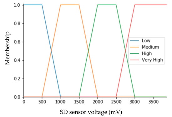 The algorithm uses voltage levels (mV) of all luminosity sensors as input variables, returning the output value (f). In the fuzzification stage, four membership functions were defined for each input variable of the fuzzy algorithm and chosen to be trapezoidal functions. The set of membership functions is depicted in Figure 9. In the algorithm, the variables are described based on the linguistic terms defined as “Very high”, “High”, “Medium”, and “Low”. The linguistic terms presented behave as linear pertinence functions by parts, acting as fuzzy subsets in the unit interval [0, 1]. The pertinence functions were established experimentally by comparing the voltage level of the sensors with the formation of shadows and the consequent interruption of the burning of the graduated tape on the Campbell–Stokes heliograph, which was subsequently adjusted empirically, according to the system analyzed. The experiments to develop the pertinence functions were carried out from 8–25 August 2017, at the Brazilian Agricultural Research Corporation (Embrapa).