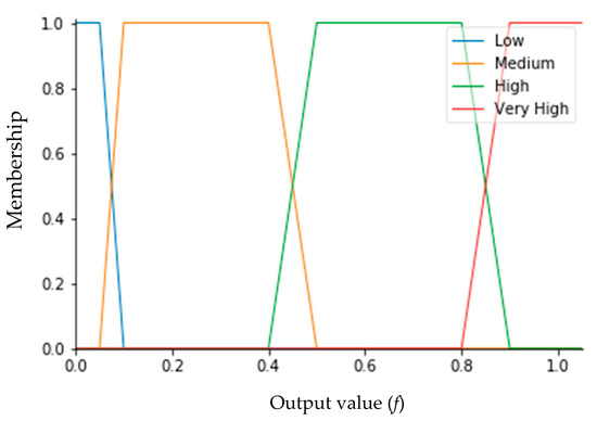 Regarding the input variables, four membership functions were also defined for the output value (f). These functions are trapezoidal, based on experimental knowledge, as shown in Figure 10. Based on this, the linguistic terms were defined as ‘Very High’, ‘High’, ‘Medium’, and ‘Low’. The range of f is [0, 1]. If variable f assumes 1, this indicates that the sky is partially cloudy or cloudy. On the other hand, if variable f is zero, this means that the sky is cloud-free.