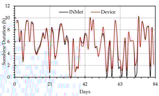 The performance of the proposed SD measurement system was compared with the data provided by the INMET for 83 days. Figure 12 shows the results between the SD measurements by the prototype with those provided by the official data (INMET).