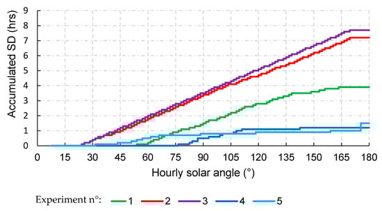 The device provides accurate measurements of the SD values of a solar angle between 23° and 159°. The measurement of sunlight for values of the solar angle outside the specified range, even on days with low cloudiness, was inefficient due to the sensitivity of the photoresist elements to low radiation levels. Figure 13 illustrates the behavior of the daily SD readings for five observations.