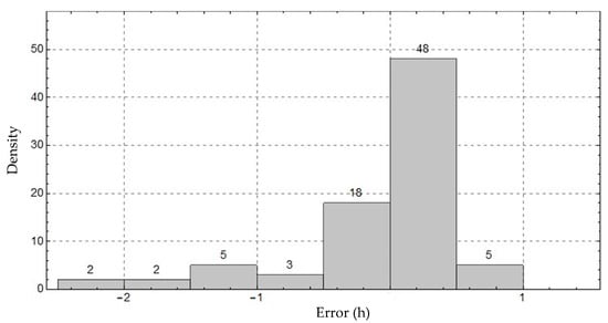The characteristics of the frequency distribution of the divergences were modeled according to a normal distribution of the mean (µ) −0.11446 h and standard deviation (δ) 0.45042 h. The behavior of the normal distribution indicated that 79.51% of the divergences were located in the range between −0.5 h and +0.5 h. Based on the behavior of the normal distribution obtained by the analysis of discrepancies, it is possible to estimate that for any measurement carried out by the prototype, the probability of this reading showing a divergence greater than 0.5 h, in relation to the official data, is 28.23%.