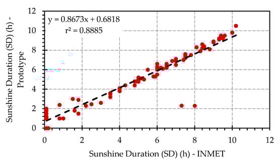 Relationship between sunshine duration (SD) measured with the proposed system and official data by the Brazilian National Meteorological Institute (INMET) for the city of Campina Grande, Brazil.