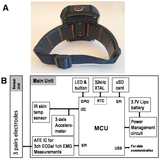 Data were recorded with the wearable armband, which is designed to be worn on the upper left arm [4]. The armband consists of two parts: (1) the main unit, which has a microcontroller (MCU), μSD memory unit, power management, and analog front end (AFE) integrated circuit (IC) unit and (2) a sensor unit, which contains three sets of carbon-black dry electrodes. These electrodes are used for recording three ECG channels and one electromyogram (EMG) channel simultaneously, and these data are stored on the μSD card. Figure 1 shows the armband and its schematic diagram.