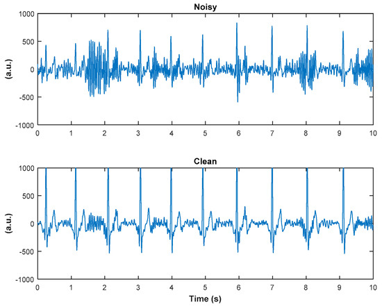 Many techniques have been proposed for denoising ECG signals. Guler and Ubeyli used a model based on a neural network for ECG denoising [5]. Several studies used adaptive filtering as a denoising algorithm [6,7], while Tracey and Miller used a nonlocal means approach [8]. Selesnick proposed a sparsity-assisted signal smoothing (SASS) method that combined low-pass filtering and generalized total-variation denoising approaches [9]. He et al. proposed a denoising algorithm that uses independent component analysis (ICA) [10]. Algorithms based on various versions of the Kalman filter have been proposed [11,12,13]. Denoising algorithms based on wavelet transform are well explored in the literature [14,15,16,17,18], while some researchers proposed denoising algorithms based on empirical mode decomposition (EMD) [19,20,21,22]. Akhbari et al. proposed a method based on a nonlinear dynamic model, which uses Gaussian functions [23]. Zhou et al. proposed an algorithm that approximates an ECG signal as the linear combination of structures and removes the additive random noise and baseline wandering [24]. Various variations of denoising autoencoders were used in [25,26].