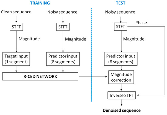 The trained network was tested only on noisy sequences from the test set. Again, the test predictors were comprised of 8 consecutive STFT magnitude spectra from noisy sequences and normalized by the mean and standard deviation computed during the training stage. The trained network was applied to normalized test predictors, when denoised magnitude STFT were obtained. These magnitude spectra of the denoised sequences were then converted back to the time domain by applying the phase of the noisy sequences and the inverse STFT [34]. This way, as the final output, we obtained the denoised sequences of noisy test sequences. The flow chart of training and test stages is presented in Figure 3.