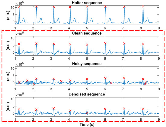 An example of the Holter sequence, corresponding clean armband sequence, a typical noisy armband sequence, and denoised signal after applying the proposed algorithm. R-peaks detected with the Pan and Tompkins algorithm are presented as red ‘x’ signs.