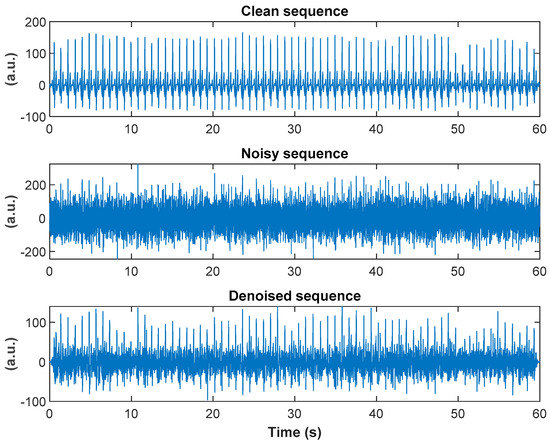 Illustrative example of one typical 60-s sequence from the MIT-BIH arrhythmia database and its corresponding noisy (corrupted with white noise with SNR = −5 dB) and denoised sequences.