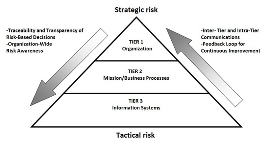 Risk management is composed of four components: framing the risk (i.e., establish the context for risk-based decisions), assessing the risk, responding to the risk, and monitoring and control the risk [14,23]. The most fundamental component is assessing the risk (i.e., risk assessment or risk estimation) [23,24]. The purpose of risk assessment is to estimate the extent to which an entity is threatened by a potential circumstance or event, namely, to estimate the risk [14,23,24]. The importance of automating risk assessment has been pointed out in the literature since it leads to a well-built risk management plan and timely decision-making [14]. According to NIST, both risk management and risk assessment are conducted at three tiers: (i) organization; (ii) mission/business process; and (iii) information systems tier, as depicted in Figure 1 [14,23].