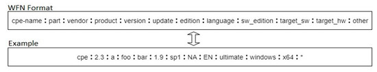 Figure 2. Well-formed CPE name structure.The CPE scheme, however, cannot describe and identify specific instances of products (e.g., using serial numbers, particular licenses, or physically discernible products) [28]. For instance, CPE can describe the XYZ Visualizer Enterprise Suite 4.2.3, XYZ Visualizer Enterprise Suite (all versions), or XYZ Visualizer (all variations) but not the XYZ Visualizer Enterprise Suite 4.2.3 with the serial number Q472B987P113 [28]. - (2)