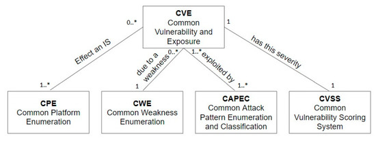 - Common Vulnerabilities and Exposures (CVE) [29,30]: A CVE is a known weakness found in specific software or hardware that can be exploited and result in an impact on Confidentiality, Integrity or Availability (CIA) attributes. Each CVE includes a unique identification number, a description, one public reference, a reference to the software or hardware that is affected (using CPE), a reference to a weakness (described in the next bullet), and its severity (described in Section 2.3).