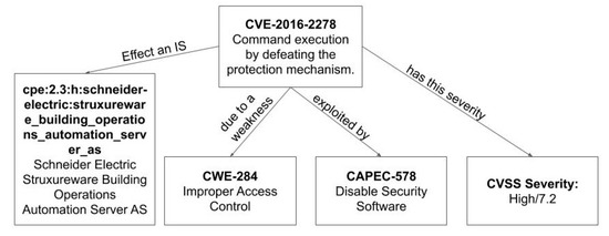 Figure 4 presents an example of relationships among CSSs and CVSS in a real case related to the CVE-2016-2278 that effects the platform “Schneider Electric StruxureWare Building Operations Automation Server AS” due to the weakness CWE-284. The particular CVE has a CVSS severity High or 7.2, and it is exploited by applying the attack pattern CAPEC-578.