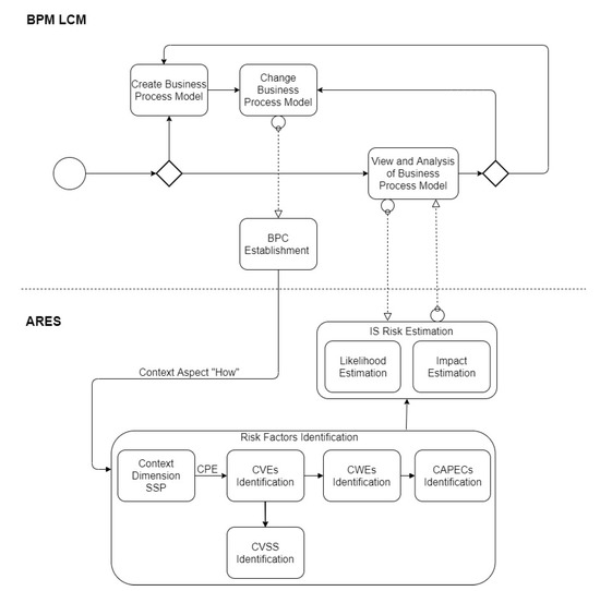 Compared to the ARES approach, no other risk assessment methodology offers such automation in conducting risk assessment utilizing the BPC. Although there are efforts synchronizing the BPM LCM and risk assessment such as in [40], they provided only high-level details regarding risk assessment automation. In contrast, the ARES approach adds adequate granularity needed for risk automation. The ARES approach enables threat identification utilizing the CSSs, another critical component necessary for modeling threat scenarios [24] that other methodologies like the [36,39] lack. Even though there were efforts like [33] that exploit the CSSs, they did not focus on risk assessment. Those that focus on risk assessment such as [35], assess risk from a vulnerability perspective without considering threats (i.e., CAPEC). Nevertheless, threats must also be identified and be taken into consideration when the risk is estimated [24]; otherwise, the risk will be overestimated. In contrast, ARES considers both the CVEs, in particular, their CVSS score and the CAPECs to estimate risk. Finally, there are efforts like [36], which estimate risk based on best practices and whether they are applied to the CPEs. In this way, however, risk cannot reflect the current threat landscape that the CVEs of the NVD or other open sources communities offer.
