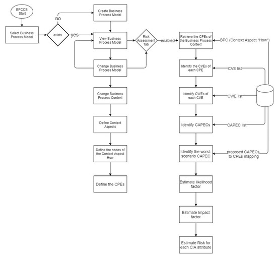 The flowchart diagram shown in Figure 10 depicts the utilization of BPCCS in applying the ARES approach. The risk is estimated and presented for each CIA attribute of each CPE supporting the business process under consideration.