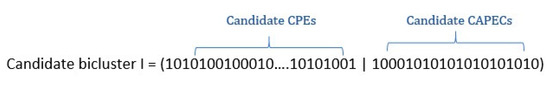 Based on the matrix (left of Figure 11), a binary matrix was created (right of Figure 11) in which the rows represent the CPEs, the columns represent the CAPECs, and each cell represents the presence (1) or absence (0) of the CAPEC associated with the CPE. The goal was to find the maximum submatrices with all 1′s representing the maximum number of CPEs with the same CAPECs. This problem is known as a biclustering problem. This kind of problem has been widely studied in the analysis of DNA microarrays for finding relationships between genes (in our case, CPEs) and diseases (in our case, CAPECs) [42,43].