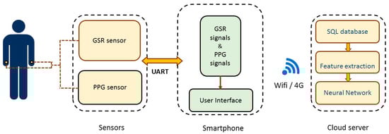 The hardware architecture of the proposed system is shown in Figure 1. It is divided into three parts, including one PPG sensor and one GSR sensor, a smartphone, and a cloud server. PPG is a signal that is recorded by using a skin area to absorb light energy according to the light sensing element. Since the hemoglobin in the blood absorbs light, the amplitude of the PPG signal changes proportionally with the blood flow in and out of tissue. In this study, we used the GSR sensor to record the skin impedance of acupoints. In TCM, it is generally believed that acupoints are the reaction points that reflect health conditions and pathological changes in the human body. Yoshio Nakatani [9] found that patients with various visceral diseases had specific skin resistance response patterns at some particular reaction points called Ryodoraku points. Incidentally, these Ryodoraku points appear to be at the same location as 24 known TCM acupoints (as shown later in Table 1).
