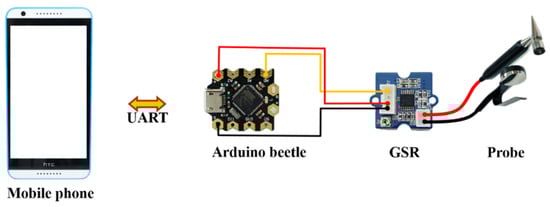 Figure 2 shows the wiring diagram of the GSR (galvanic skin response) sensing unit, which is comprised of an Arduino beetle board, a GSR module, and a probe. A mobile phone is used to transmit the GSR data to the cloud as well as to provide 5 V power to the Arduino beetle through a USB OTG. The GSR module (Seeed Studio, Shenzhen, China) consists of a bridge circuit and an amplifier. The bridge circuit is used to measure resistance. Its working principle is similar to that of a potentiometer. After the measured resistance is converted to a voltage through the bridge circuit, the amplifier amplifies the signals to the desired magnification. The amplified signals are read by the ADC (analogue digital converter) on the Arduino beetle and then relayed to the phone over UART (universal asynchronous receiver transmitter). Given that most phones usually do not have externally available UARTs, a USB-serial converter is employed for the communication between the phone and the Arduino beetle.