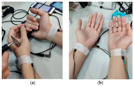 The proposed system was implemented on the Android platform. Both the control packets and data packets were sent over UART between the phone and the PPG/GSR sensor. Note that, considering the resolution of the ADC on the Arduino beetle board is 10 bit while the packet size of UART is only one byte, we used a simple LZ-based method to compress the sensor data into one byte. During the measurements, as shown in Figure 3a, one end of the GSR probe was put on the palm while the other end was placed on the targeted acupuncture point. For the PPG measurements, the sensor was placed on the “Guan” position, which is adjacent to the styloid process of the radius bone (at the medial portion of the bulge of the prominent bone proximal to the palm) [11], following the practice used in traditional Chinese medicine. We used adhesive tape to wrap the PPG sensor around the wrist, as shown in Figure 3b, to reduce movement artifacts during the measurements. The sample rates for the PPG and GSR sensor were 25 Hz and 200 Hz, respectively. For the PPG, we collected all of the raw data. We only recorded the median of the GSR measurements for each acupuncture point.