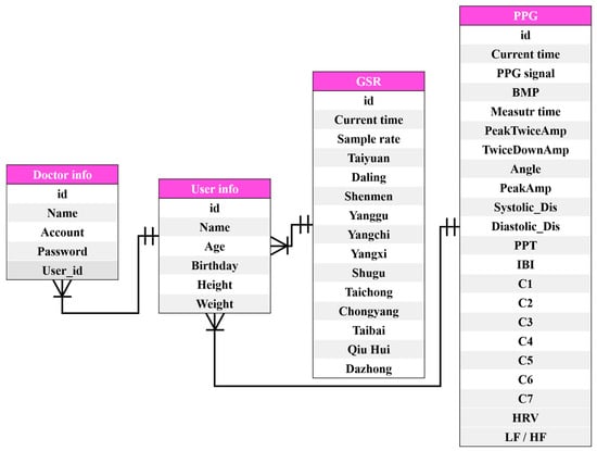 We used MySQL to store the GSR and PPG signals (including 18 features computed from the PPG signals (which will be discussed shortly). The ER (entity-relationship) model of the SQL tables is shown in Figure 4.