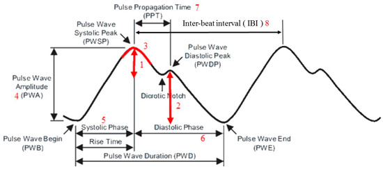 Once the pulse wave systolic peak (PWSP), the pulse wave begin (PWB), and the pulse wave diastolic peak (PWDP) were identified, we could then compute the eight time-domain features, as shown from Equation (1) to Equation (8). Specifically, the location of the PWSP, PWB, and PWDP were given a 2D coordinate (x,y), where x is the amplitude of the feature point, and y is the timing in the signals. For example, PWSP(x,y) refers to the 2D coordinate of PWSP, and PWSP(x) indicates the x coordinate of PWSP. Feature 1, Feature 2, and Feature 4 could be computed using the basic Pythagorean theorem. The PWSP angle (Feature 3) was estimated by first connecting the PWSP with the sampled point before and the sampled point after into a triangle. The PWSP angle could then be computed using the inverse trigonometric function.