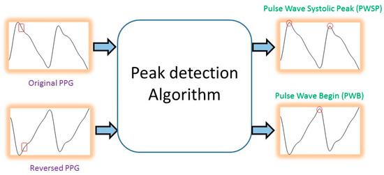 After removing the noise from the PPG waves, we first considered the three feature points for the time-domain features: the pulse wave systolic peak (PWSP), the pulse wave begin (PWB), and the pulse wave diastolic peak (PWDP), as shown in Figure 5. Once these feature points were located, the eight time-domain features shown in Figure 5 could be computed accordingly. To detect the pulse wave systolic peak (PWSP), we implemented an algorithm based on an event-related moving average [20]. This method consists of three stages: signal pre-processing (including bandpass filtering and squaring), generation of blocks of interest using two moving averages, and classification-based adaptive thresholding. The location of the pulse wave begin (PWB) can be detected using the same algorithm by changing the input to the reversed PPG signals (so that PWB becomes the maxima in the signals, as shown in Figure 6).