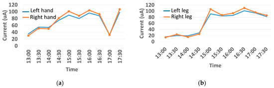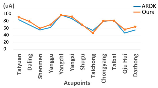 For validation of the proposed GSR sensor device, we used a commercial device called ARDK® (Automatic Reflexodiagnostic Komplex; AleXorA BioMedical Technologies Inc. Quezon City, Philippine) [23] as our benchmark. In addition, we also validated the output of our GSR device with a multi-meter (CHY-36C). Four resisters were used (their resistances were 384 kΩ, 806 kΩ, 3.52 MΩ, 990 KΩ, and 3.81 MΩ, respectively), and our GSR device output the same readings as those from the multi-meter when measuring these resisters. When measuring the acupoints, the output of the proposed GSR device was consistent with the ARDK output (the correlation on average, based on 20 participants, was higher than 95%), as shown in the example in Figure 9.